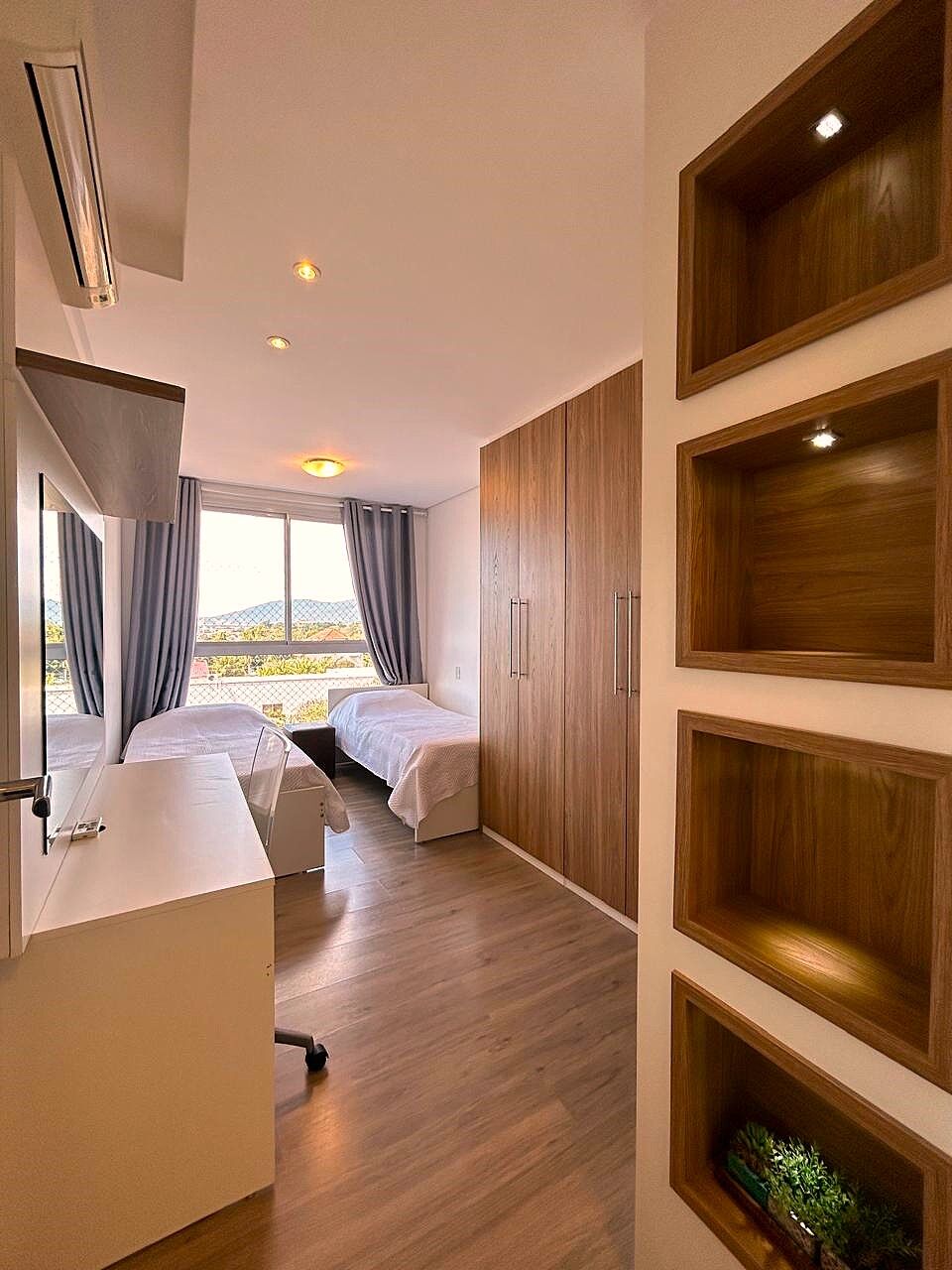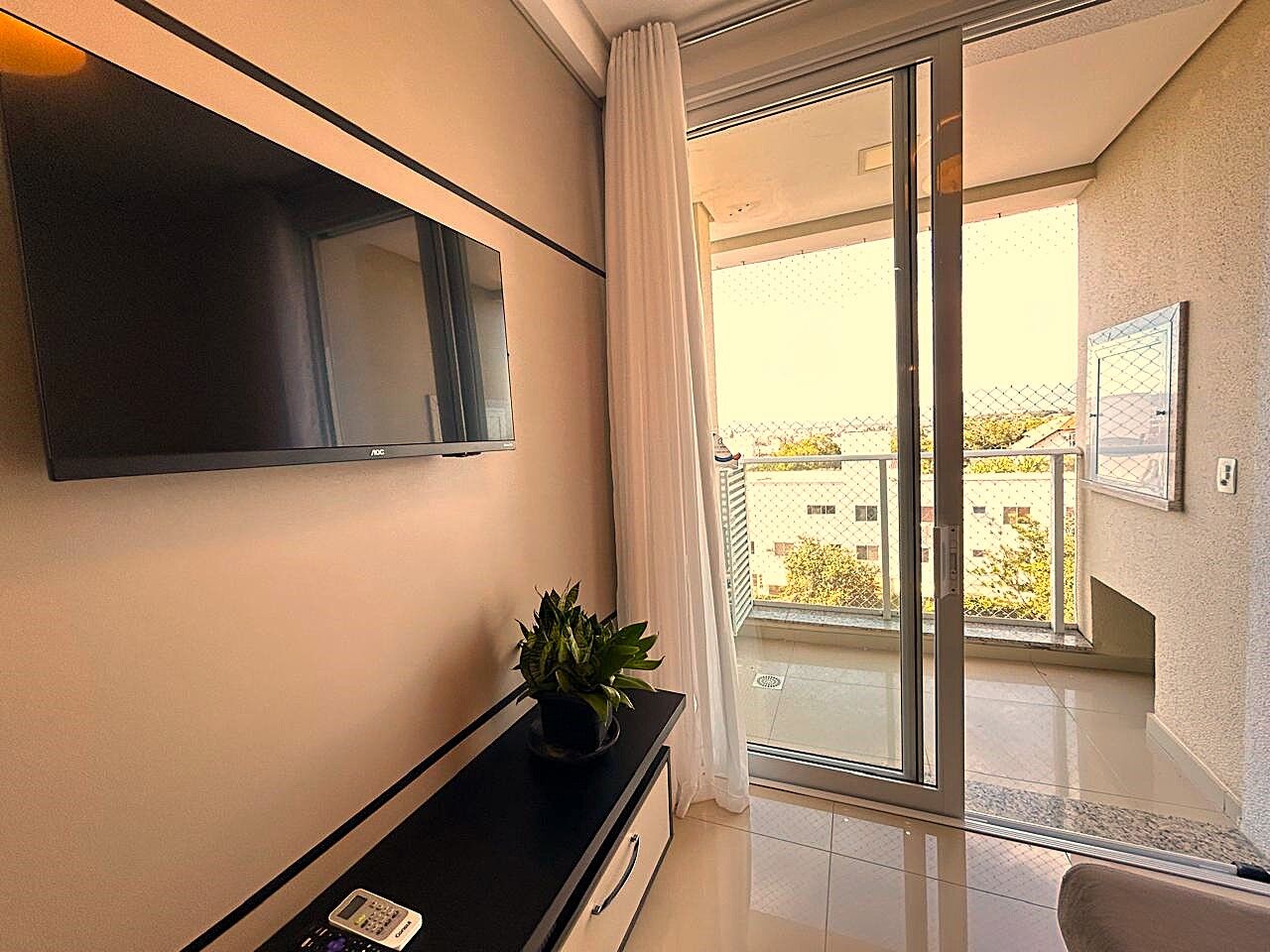 Apartamento com 2 dormitórios/quartos sendo 1 suíte com closet, banheiro social , amplo living integrado com sacada e churrasqueira com linda vistra para o mar e vegetação , 1 vaga/box coberta, semimobiliado em Canajurê/Jurerê/Florianópolis/SC.