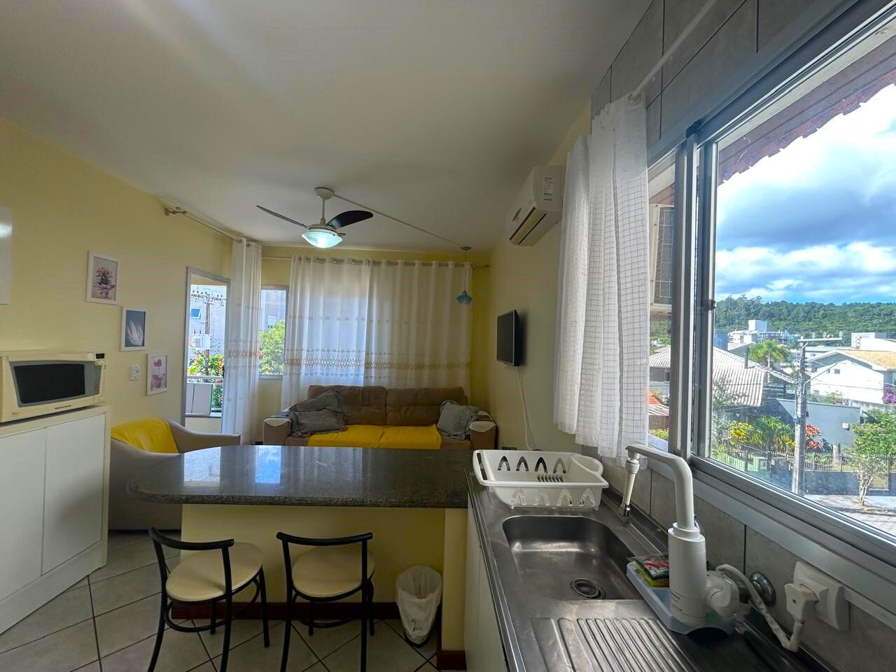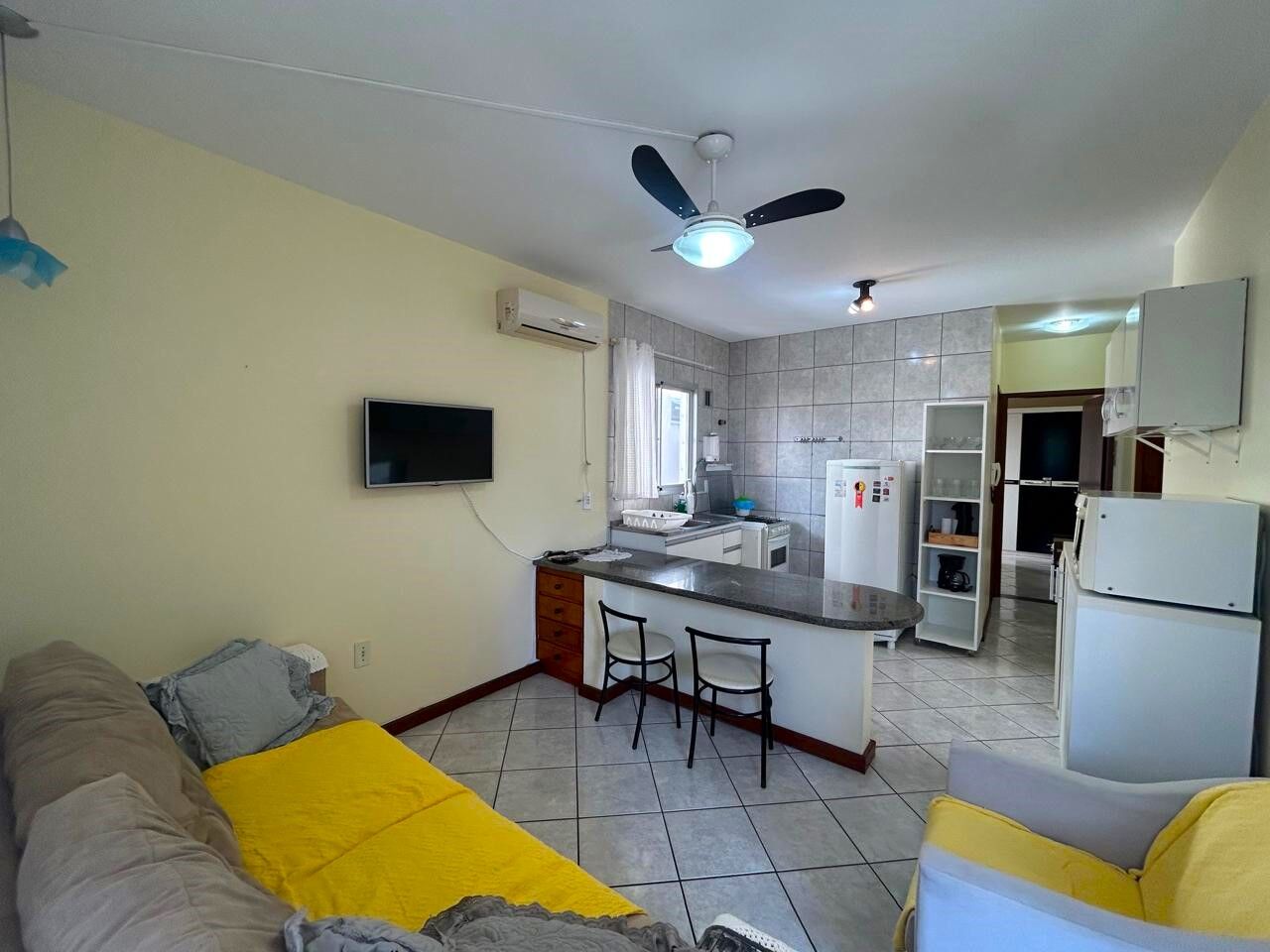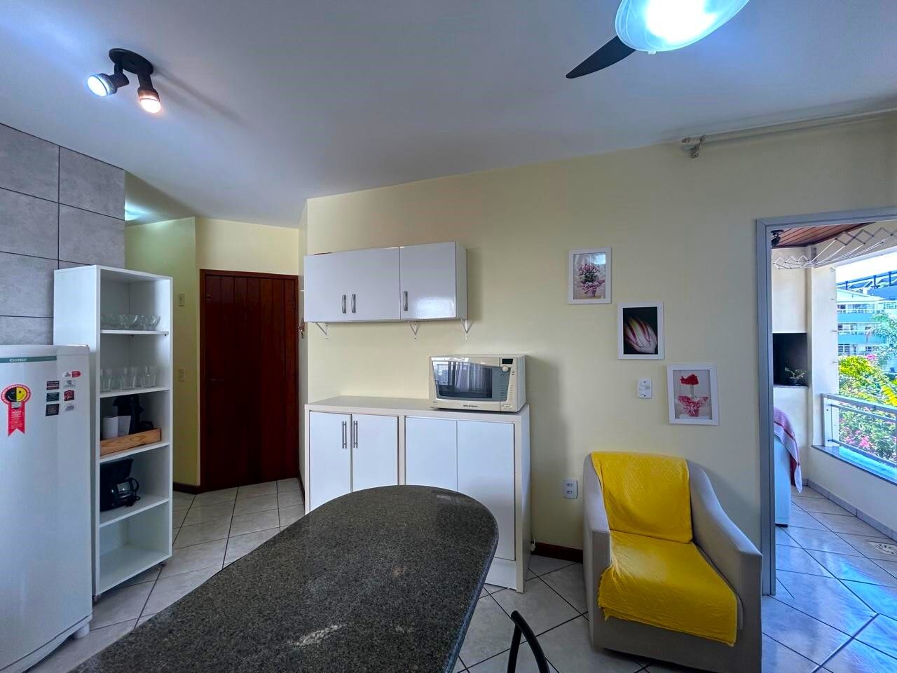Apartamento de 1 dormitório/quarto , cozinha, living , banheiro social, sacada cvom churrasqueira, 1 vaga/box , mobiliado , 3 quadras do mar em Jurerê.